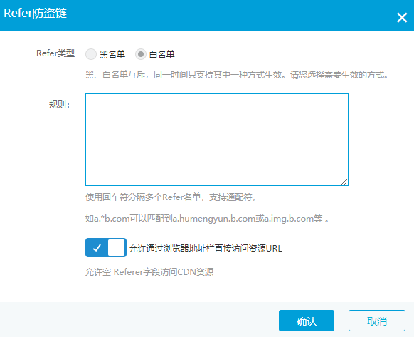 - 您可以设置是否允许空Referer字段访问资源,即允许通过浏览器地址栏直接访问资源URL。