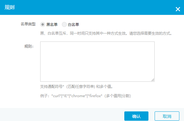 配置User-Agent字段时,用|分割多个值,支持通配符号*。例如:*curl*|*IE*|*chrome*|*firefox*
