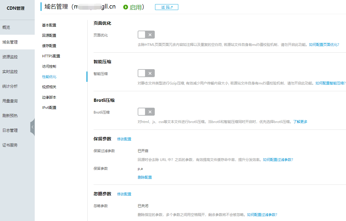 按照路径【控制台】→【CDN管理】→【域名管理】→【访问控制】→【性能优化】→【智能压缩】,打开开关即可。
