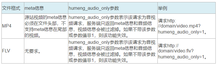 开启听视频功能后,需要配合请求参数humeng_audio_only使用。支持的文件格式如下表所示。