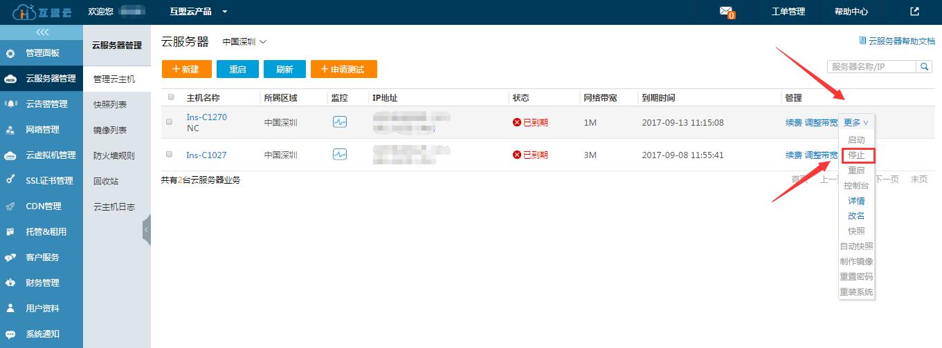 Step5:点击管理列下的“更多”,在下拉列表中点停止,即云服务器将会关机;